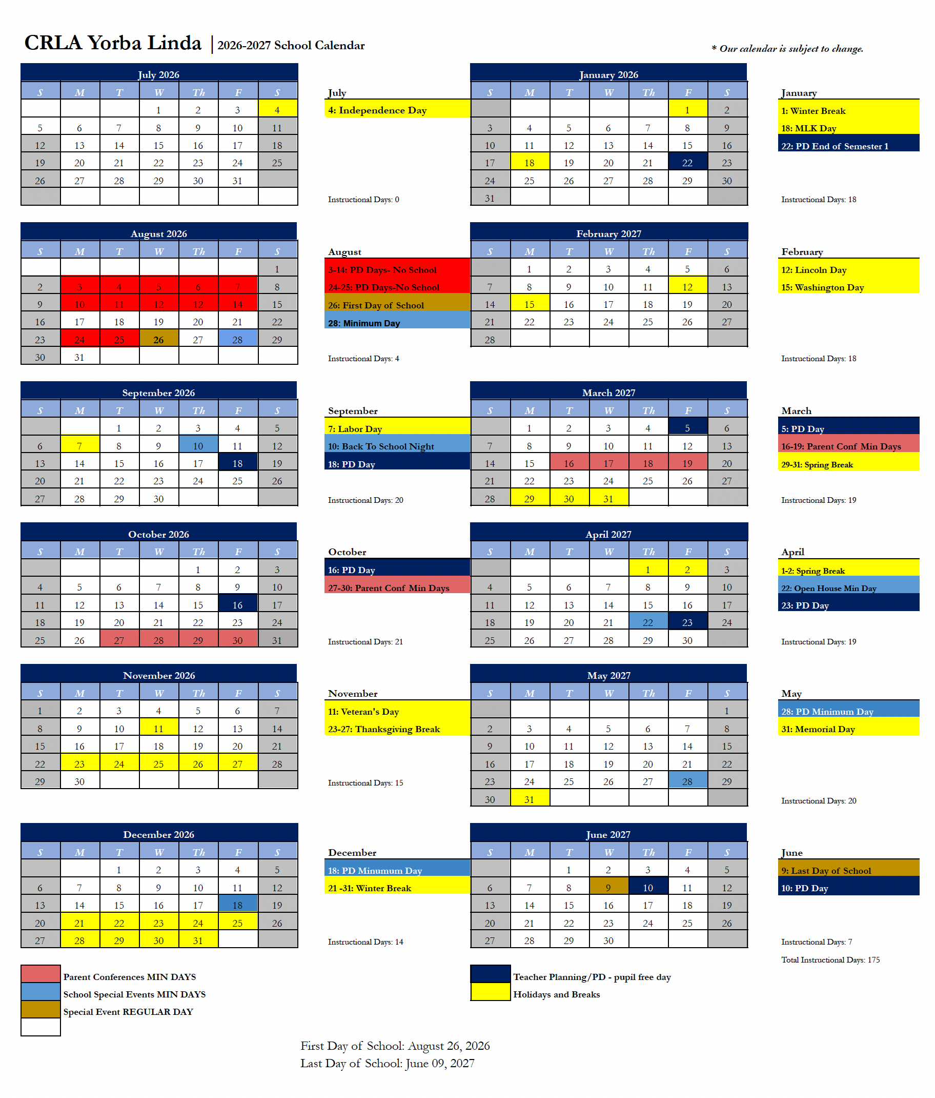CRLA Yorba Linda is a 5-day a week, site based, program that operates on a traditional calendar. The Bell Schedule is below.